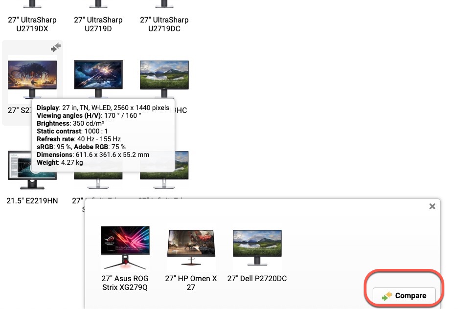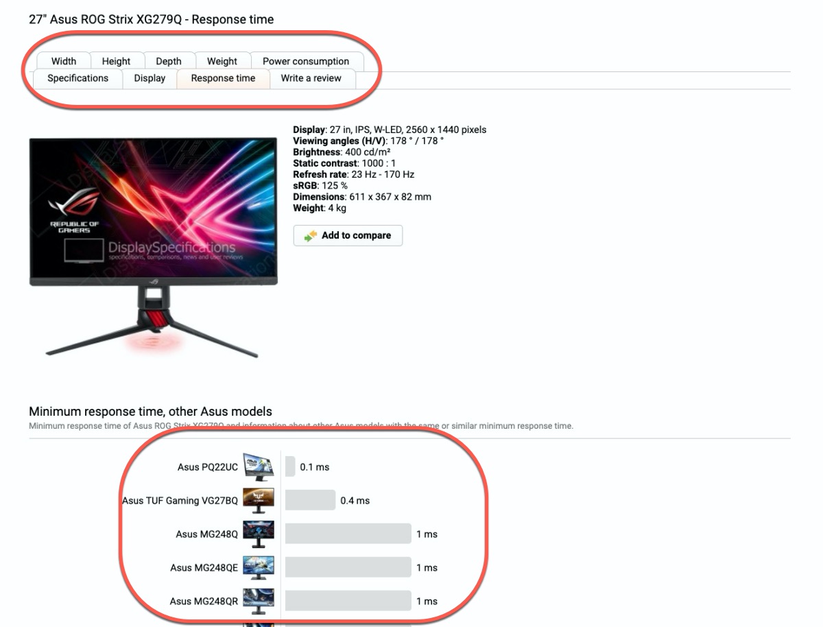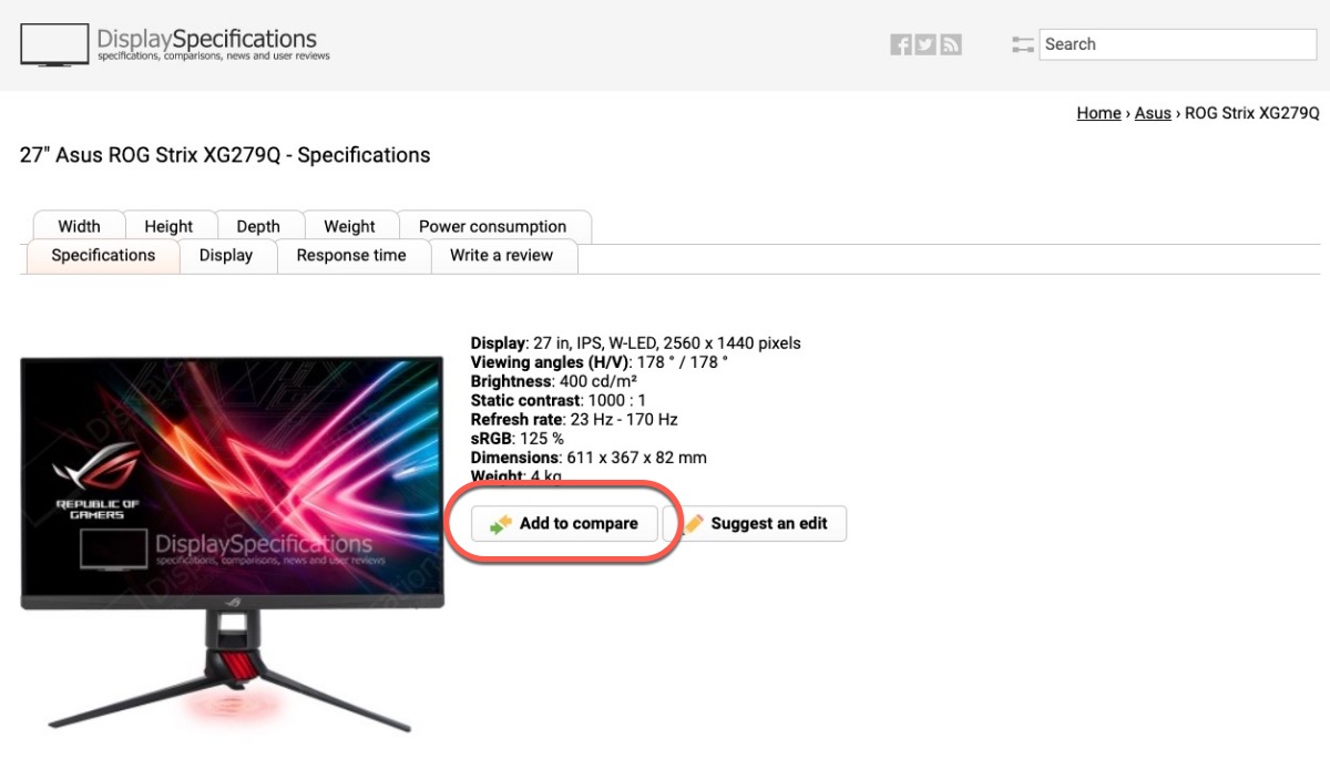 再點進型號後就可以查看該螢幕的詳細規格、資訊,如果你想要加入比較,只要按 Add to compare,就會列入比較列表。