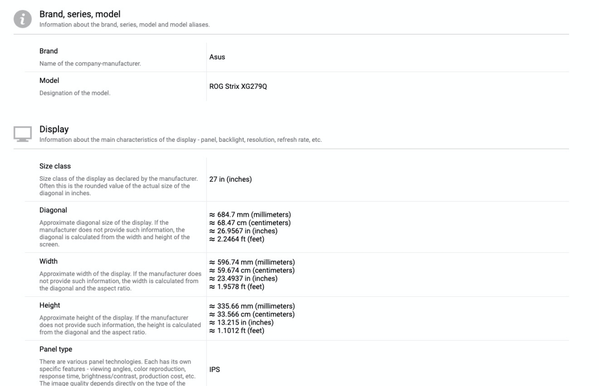 往下拉你會發現列出來的規格應有盡有,除了一些基本的尺吋規格、反應時間、色域等,規格詳細到一個不行,比起你單純在線上購物看來的清楚。