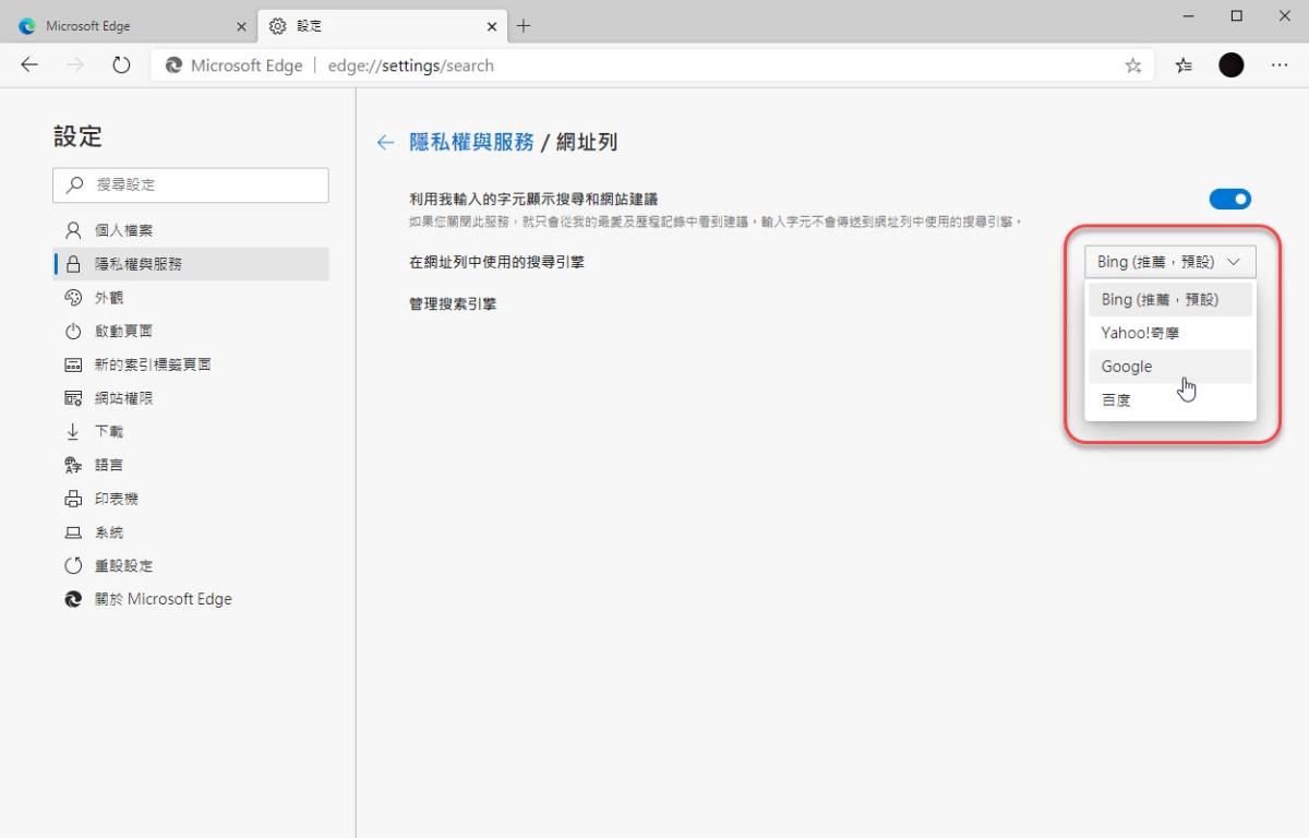 然後就可以修改網址列預設的搜尋引擎,雖然是基於 Chromium 核心,但微軟做的嘛,總還是會預設為 Bing,如果你習慣 Google 搜尋就在這裡修改吧,其實這二點修改後,就應該跟你在 Chrome 上使用沒有什麼二樣了。