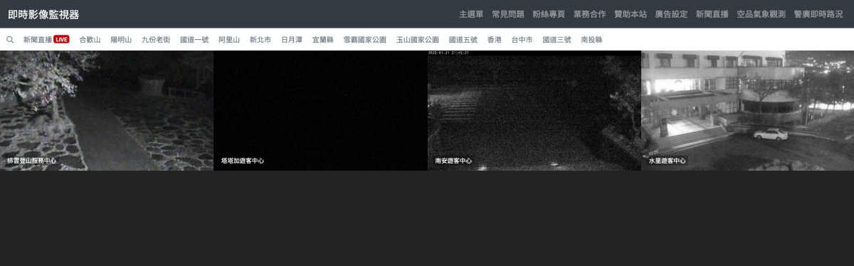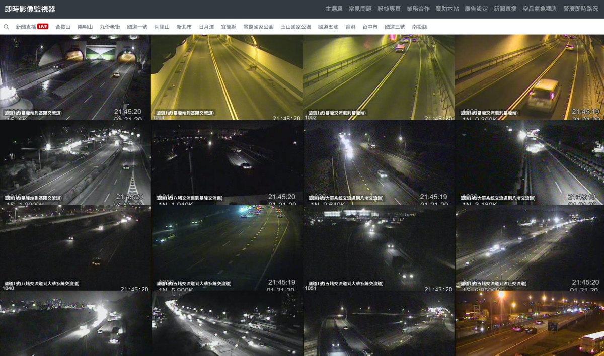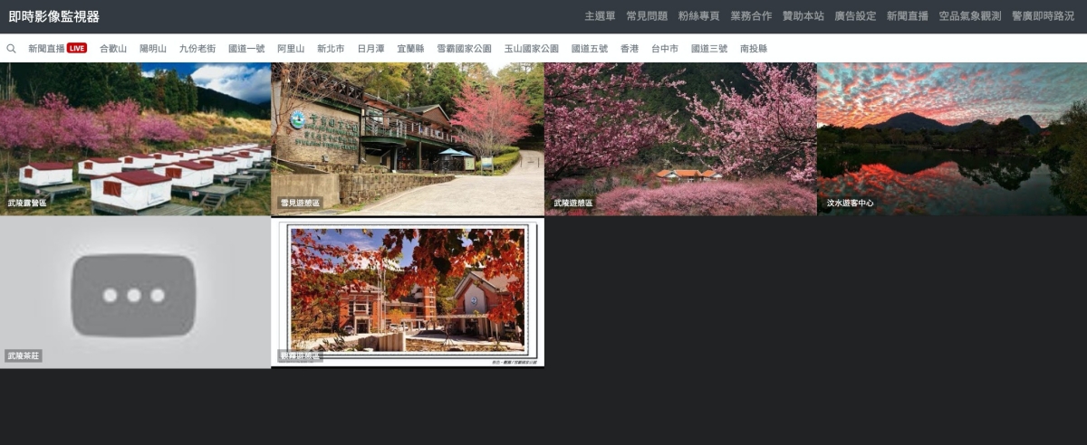 網站:https://cctv.taskinghouse.com/這網站搜集了全台各地的公路、省道、高速公路的即時影像之外,還包括了一些知名的景點,像是陽明山、雪霸國家公園、合歡山等,非常的多,想要看哪一個就點哪一個。