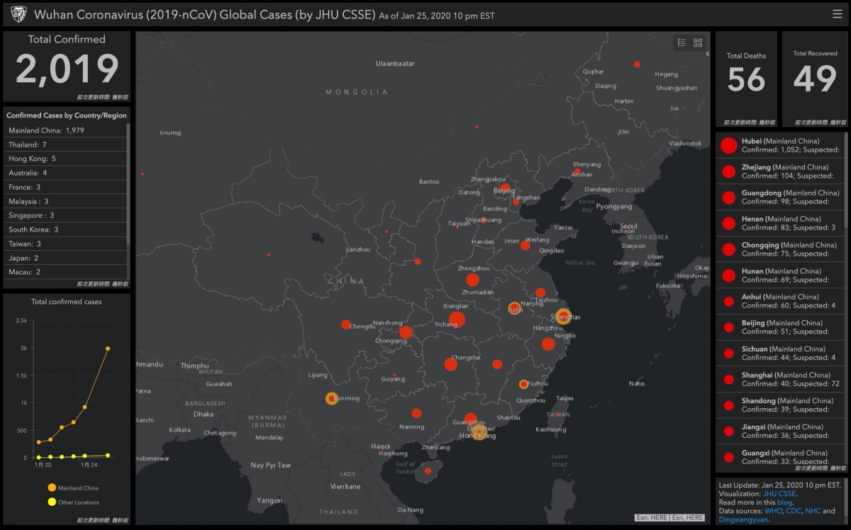 地圖上的紅點點點擊後可以查看該地區的各種人數狀況,以台灣來說,到 1/25 為止,一共有三個人確診,不過其實到 1/26 已經共四個人了,大家出門記得還是要戴一下口罩。