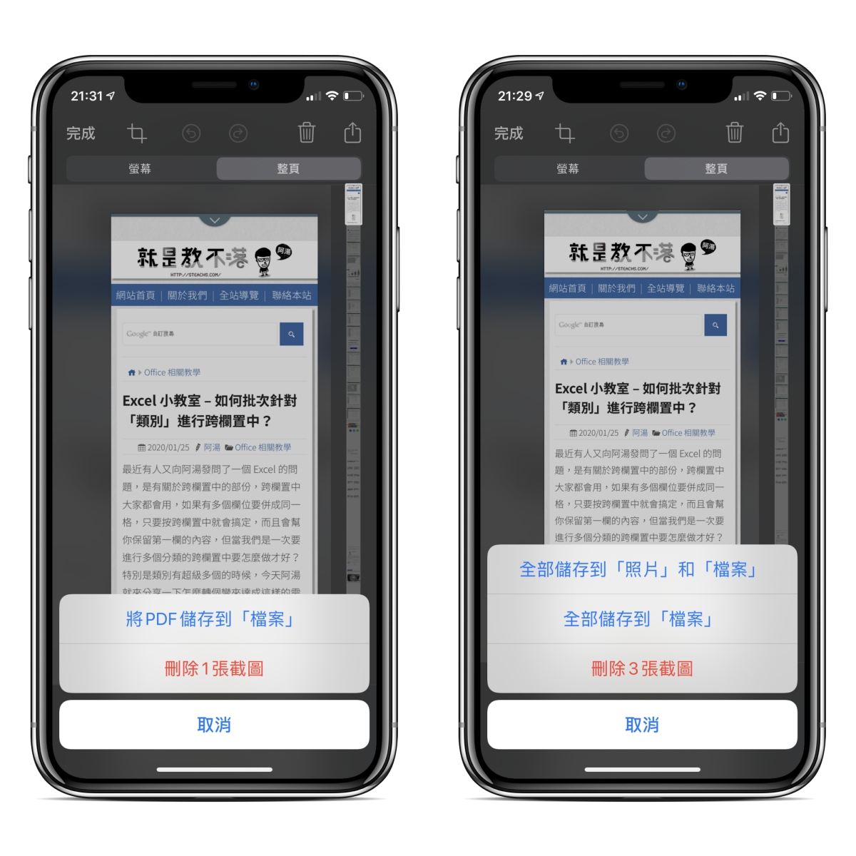 點擊左上角的完成就可以儲存,會有二種狀況,如果你點擊進來整頁後沒有再去拖動任何畫面,直接點擊完成就會出現下圖左,直接把整頁可以儲存成 PDF 檔案,如果你是去拖動預覽過,你會發現變成是下圖右,這時會多一個選項是可以同時儲存到照片跟檔案,阿湯試了一下,如果選直接儲存到檔案同樣是 PDF 檔案,如果是選第一個的話,照片裡會是儲存截圖,檔案則是儲存 PDF,提供給大家參考。