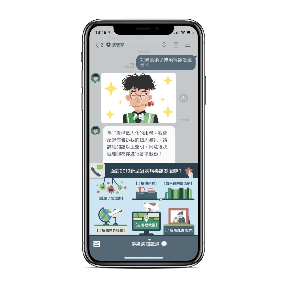 疾管家 LINE@:請點我(用手機開啟比較方便) 也可以在 LINE 搜尋官方帳號「疾管家」或「@taiwancdc」加入後就可以點擊各種資訊來查看,會是互動的方式來讓你獲得需要的資訊。