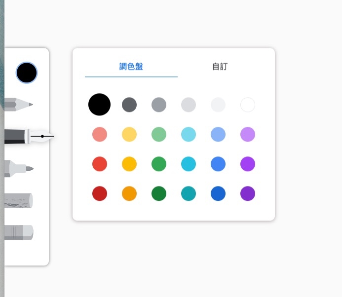 左邊就只有五種筆刷,看起來沒有其他功能,也沒有粗細可以選擇,單純就是筆刷跟顏色,除了預設調色盤之外,也能自訂顏色。