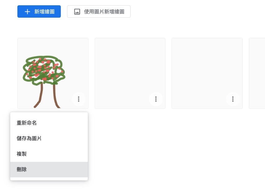 當你繪圖後,下次再進入 Chrome Canvas 時,在首頁就會顯示你曾經畫過的圖,這時你可以選擇再新增一個,或者選擇現有,甚至也可以開啟某張圖片或照片來繪圖,其實功能基礎但相當實用。