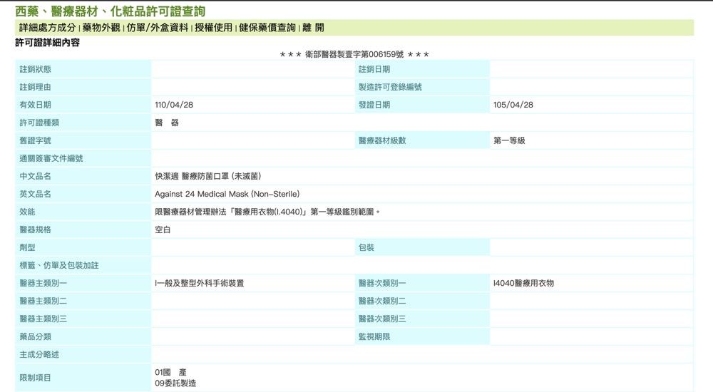 3) 這時如果這個號碼是真的合格的,我們便能看見這款口罩的製造商、有效日期等資訊,也就能夠安心的使用了!