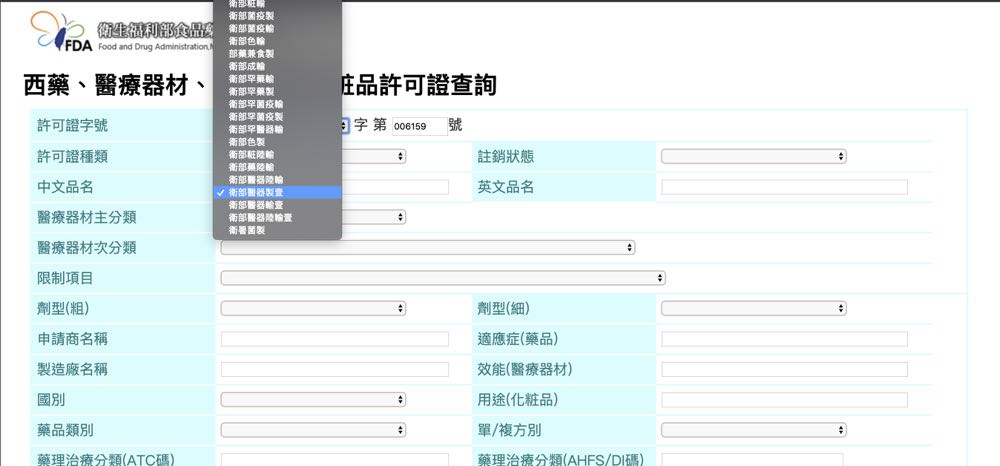 1) 首先開啟衛福部食品藥物管理署 西藥、醫療器材、特定用途化粧品許可證查詢