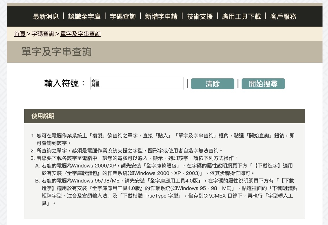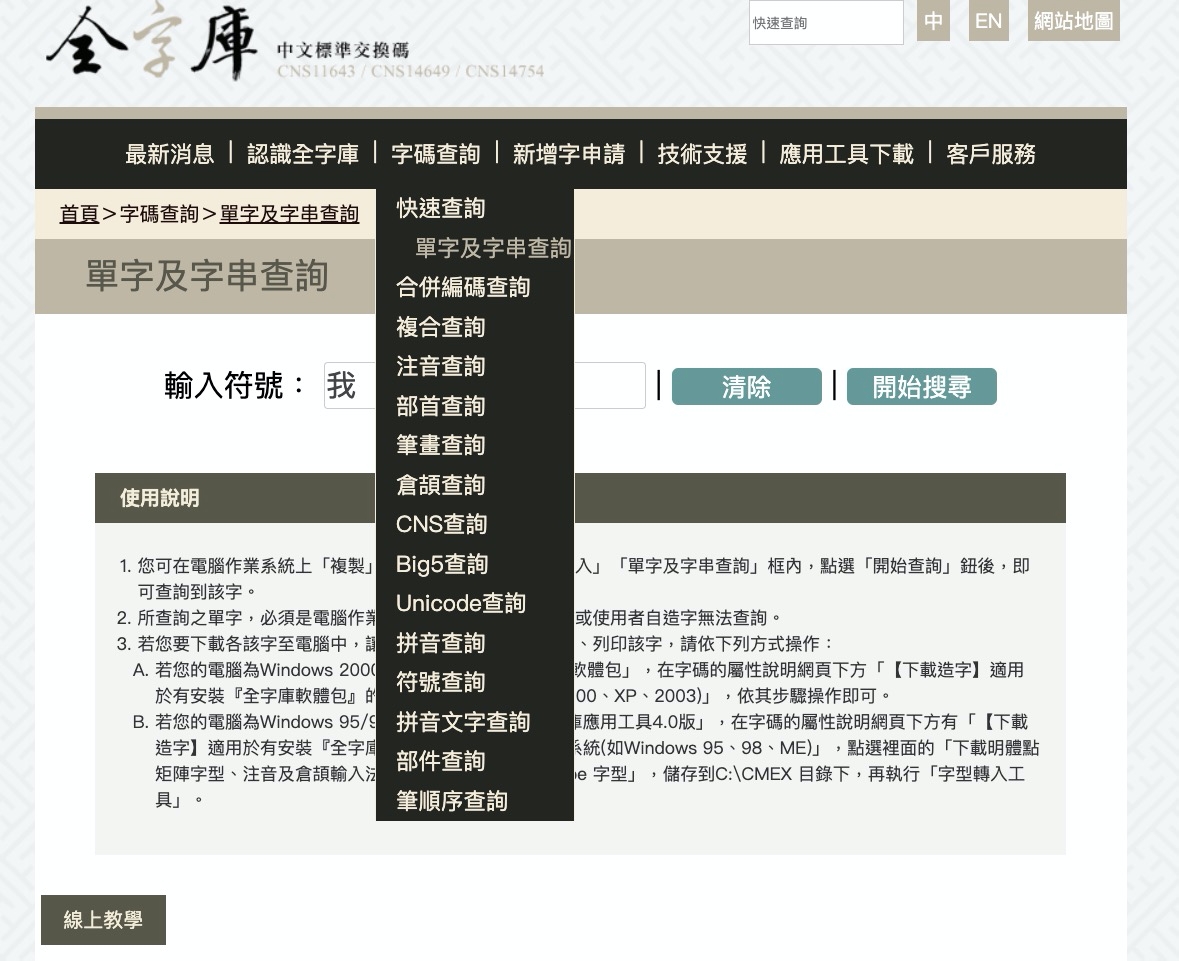 首頁 › 線上工具/服務 › 全字庫字碼查詢工具,一次告訴你注音、倉頡字根、拼音及 Unicode 代碼等相關資訊 全字庫字碼查詢工具,一次告訴你注音、倉頡字根、拼音及 Unicode 代碼等相關資訊 發佈日期:2020/2/3 作者:阿湯 分類:線上工具/服務 先前就分享過國發會提供「全字庫」字型讓大家可以免費使用,不過這個全字庫不單單只有提供這個免費字型,其實裡面還有很多關於「文字查詢」的功能,比如想知道某個字的英文拼音,注音是什麼、倉頡字根是什麼、部首或是 Unicode 代碼等,一次就能查的到,而且還提供文字發音,如果家中有小朋友正在學國字,這或許也是很棒的學習輔助網站。 全字庫字碼查詢工具 全字庫官方網站:https://www.cns11643.gov.tw/index.jsp 進入全字庫官方網站後,可以在字碼查詢中,選擇「單字及字串查詢」。 然後輸入你想要查詢的國字,按下開始搜尋。 接下來就會在字形資訊中顯示非常多資訊,其中包括發音、拼音、CNS/Unicode/Big-5/EUC 各種代碼,最下方還有部首、筆畫及倉頡字根可以查看,對於學習國字或是倉頡拆解字根都有很棒的輔助效果。