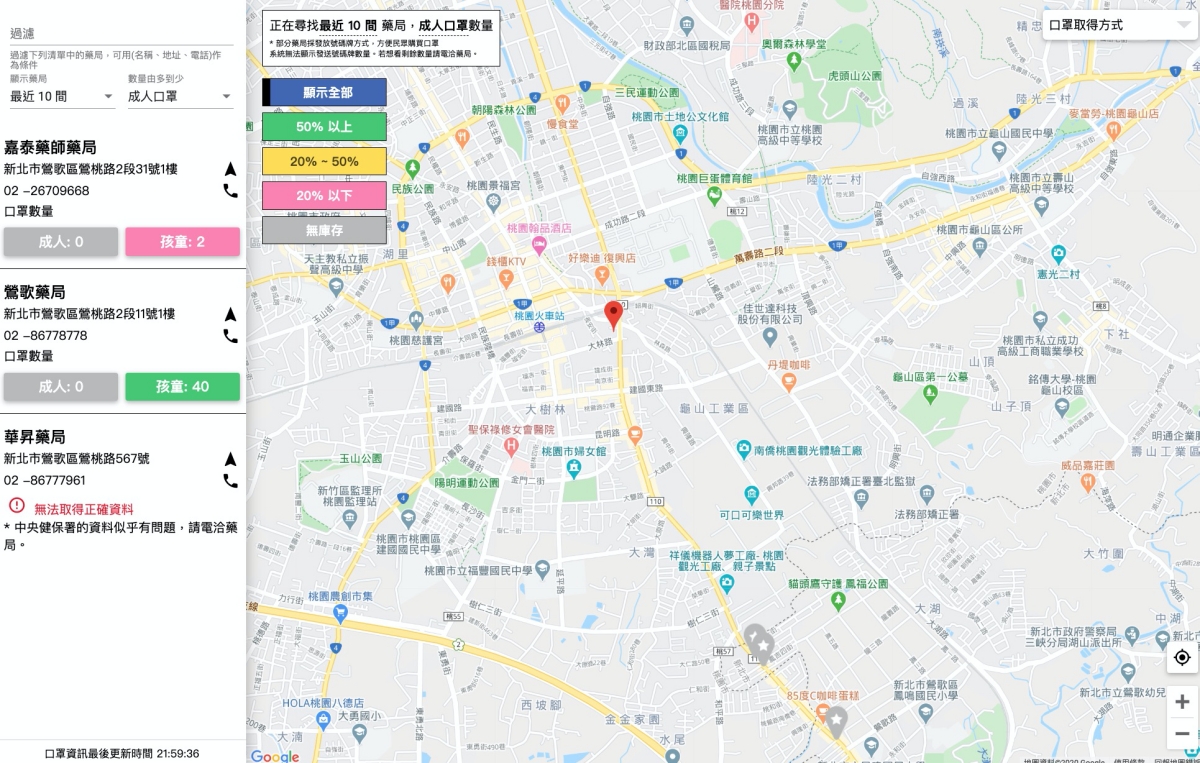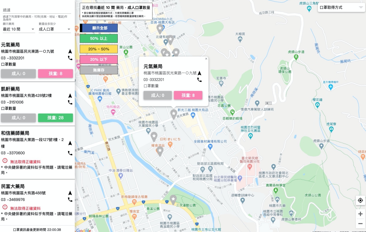 網站:https://mask.goodideas-studio.com/進入口罩地圖後,可以直接定位,然後會自動顯示離你最近的十間藥局資訊,左邊那欄位會顯示成人及兒童口罩的庫存量各剩下多少,部份藥局會沒有顯示資料,目前其實大多是成人的缺貨,兒童的還算好買,大家可以去試看看。
