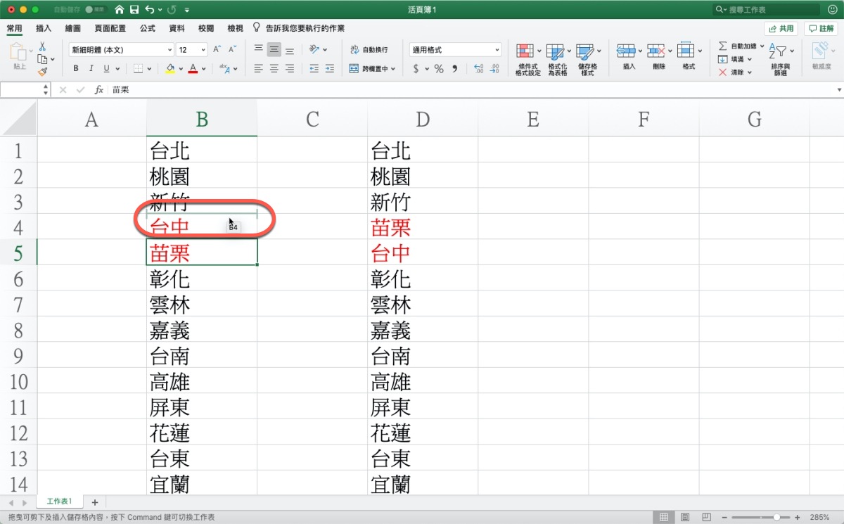 首先,需求大概是像這樣,原本在輸入資料你可能發現哪邊順序相反了,想要調整回來,比如以這範例來說,由北至南應該是先苗栗再台中,那麼我們要怎麼對調過來最快,往下來看。