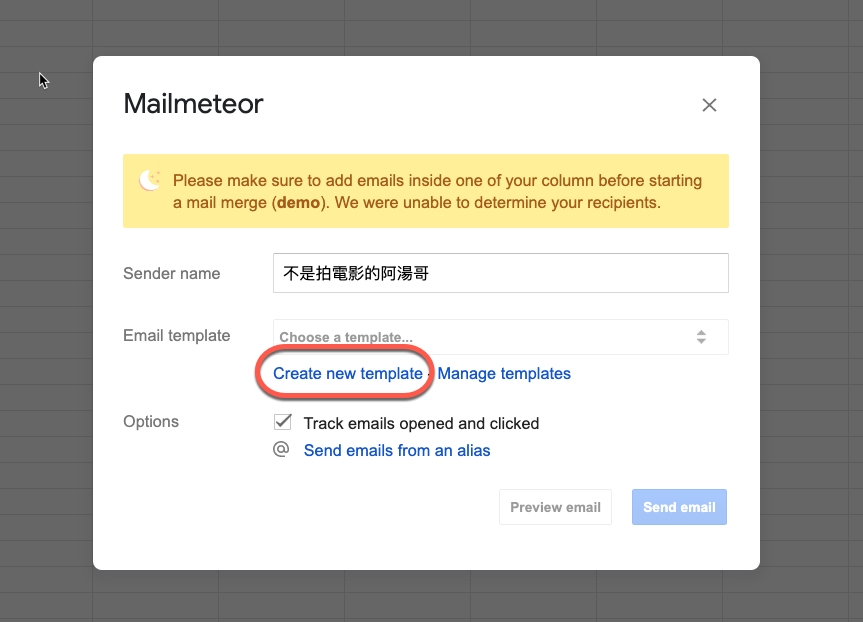 回到這個畫面時,就可以看到 Email Template 已經選了好你剛剛編輯的範本,Summary 的部份可以注意一下他抓取要寄送的 Email 欄位是否是你填寫的那一欄,像阿湯是打在 B 欄,就有顯示 column B,確定無誤後就可以按下 send emails 寄出。