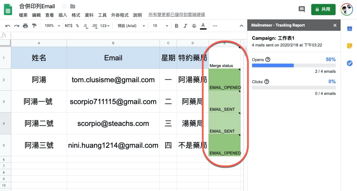 然後在原本的試算表最後面,也會有個 Merge status,也就是 Email 的狀態,如果是 Sent 就是已經寄出,如果是 Opened 就是對方已經讀取內容了,最右邊還可以查看目前開啟的比例有多少,如果你的 Email 裡有放置連結,還可以知道有多少人點擊了,每天一百封免費真的是佛心來著,大家可以好好的善用。