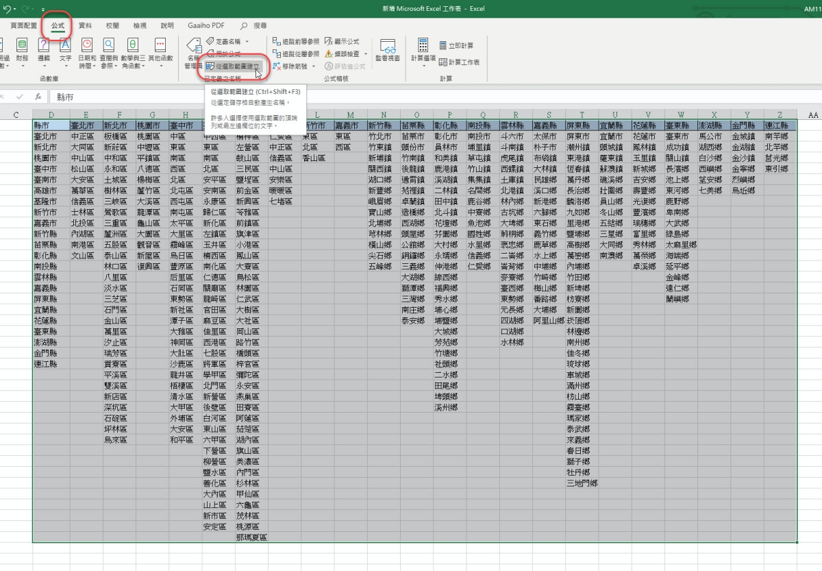 接下來將資料的範圍全選後,進入「公式」>「從選取範圍建立」。