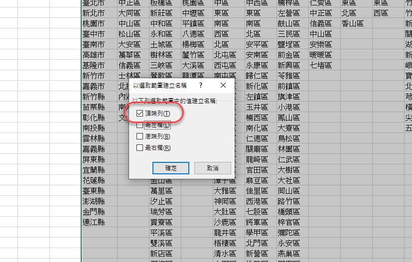 然後只勾選「頂端列」,按下確定,到這邊就完成了全部的名稱定義了。