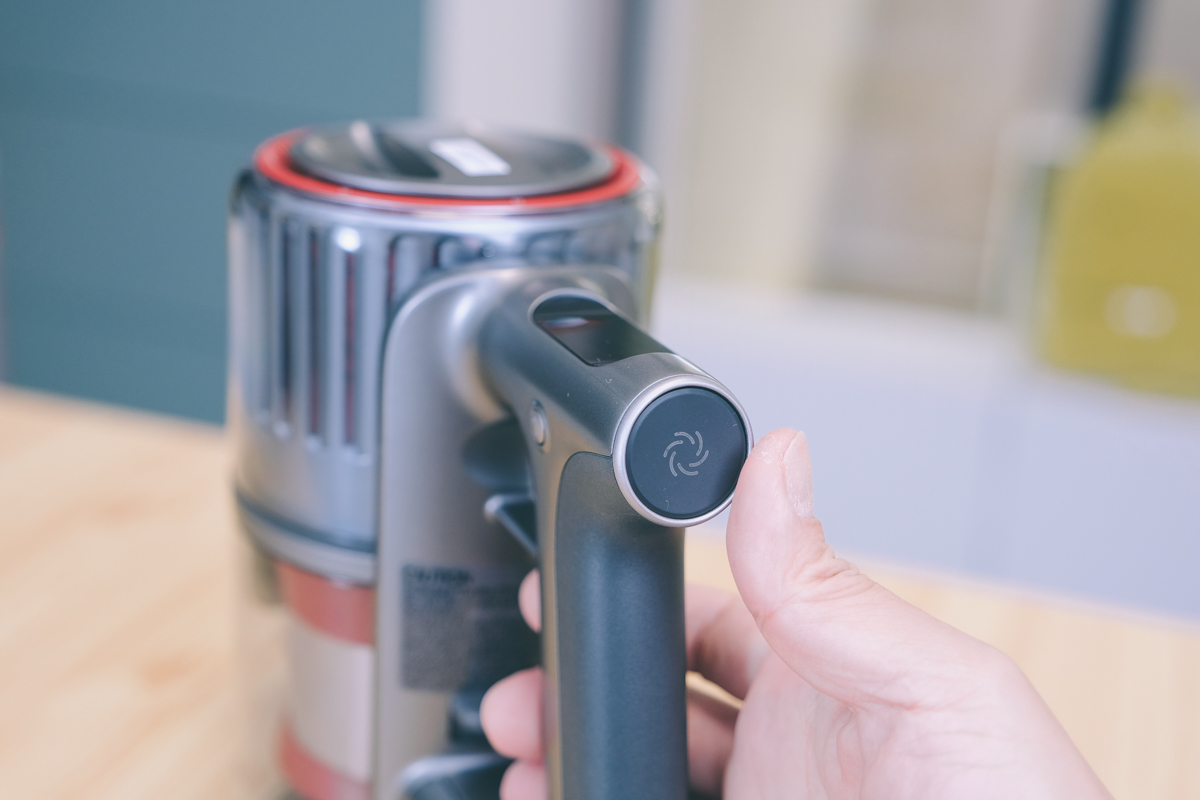 手握處後方的按鍵是用來切換吸力的模式,H6 的設計有一個部份我覺得不錯的是,可以預先切換好吸力模式再啟動,大多數都是要在啟動吸塵器後才能切換。