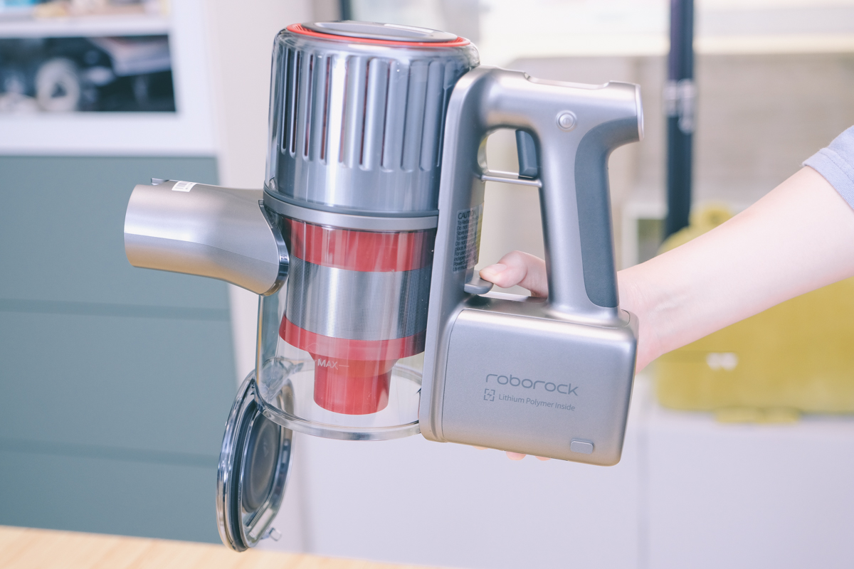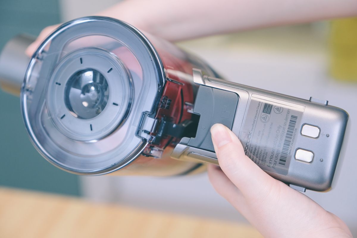 傾倒垃圾的設計,沒意外應該是我首次看到傾倒垃圾的開蓋按鍵設計在握把處,幾乎所有的操作都在握把的範圍內,而且設計在這裡按壓是更加真正的不沾手,按一下就能傾倒垃圾,再加上機身僅 1.4kg,即便是女生也能輕鬆的單手操作。