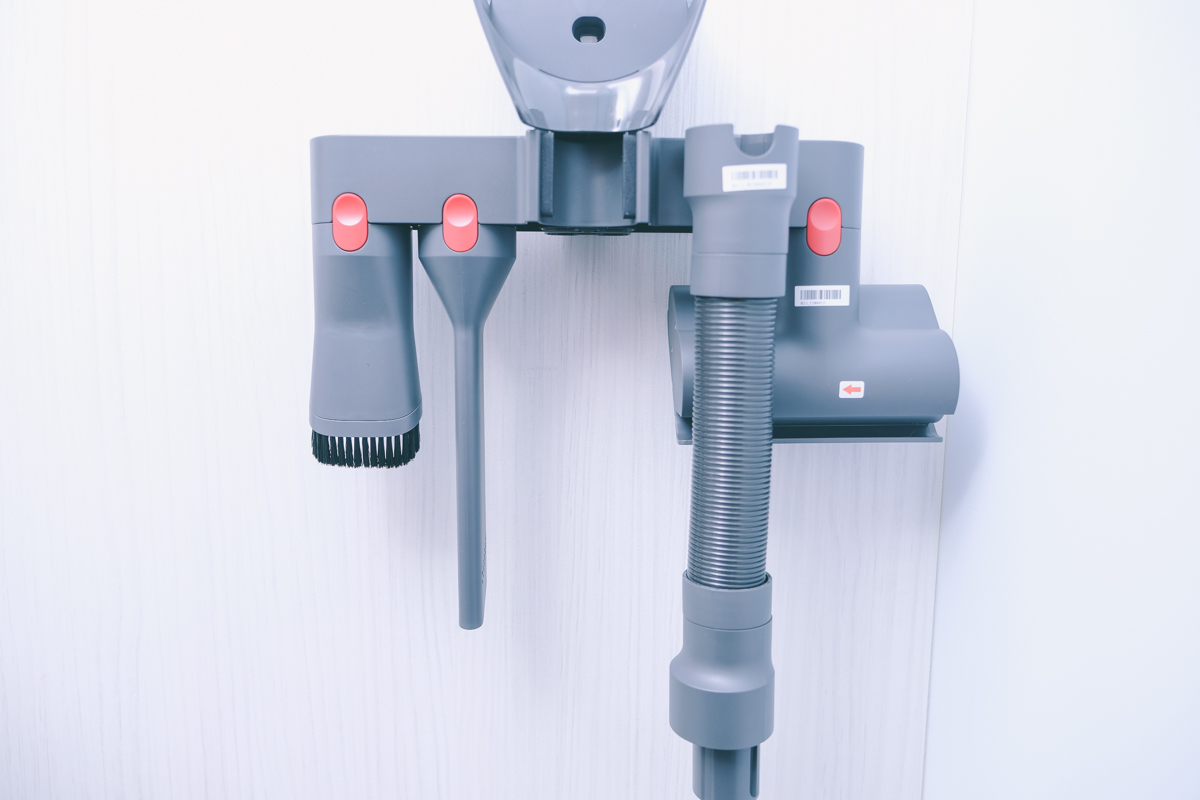 最後,充電壁掛架的設計也相當的不錯,標配的多種配件通通都能掛上去,不用再分地方收納, 一般吸塵器的收納架都只設計給「常用配件」的收納,多出來的只能額外再找地方收納。