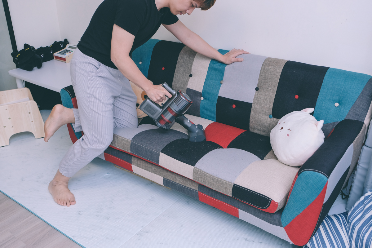 第二步驟就是換上電動除蟎刷開始清理客廳的沙發跟臥室的床舖。