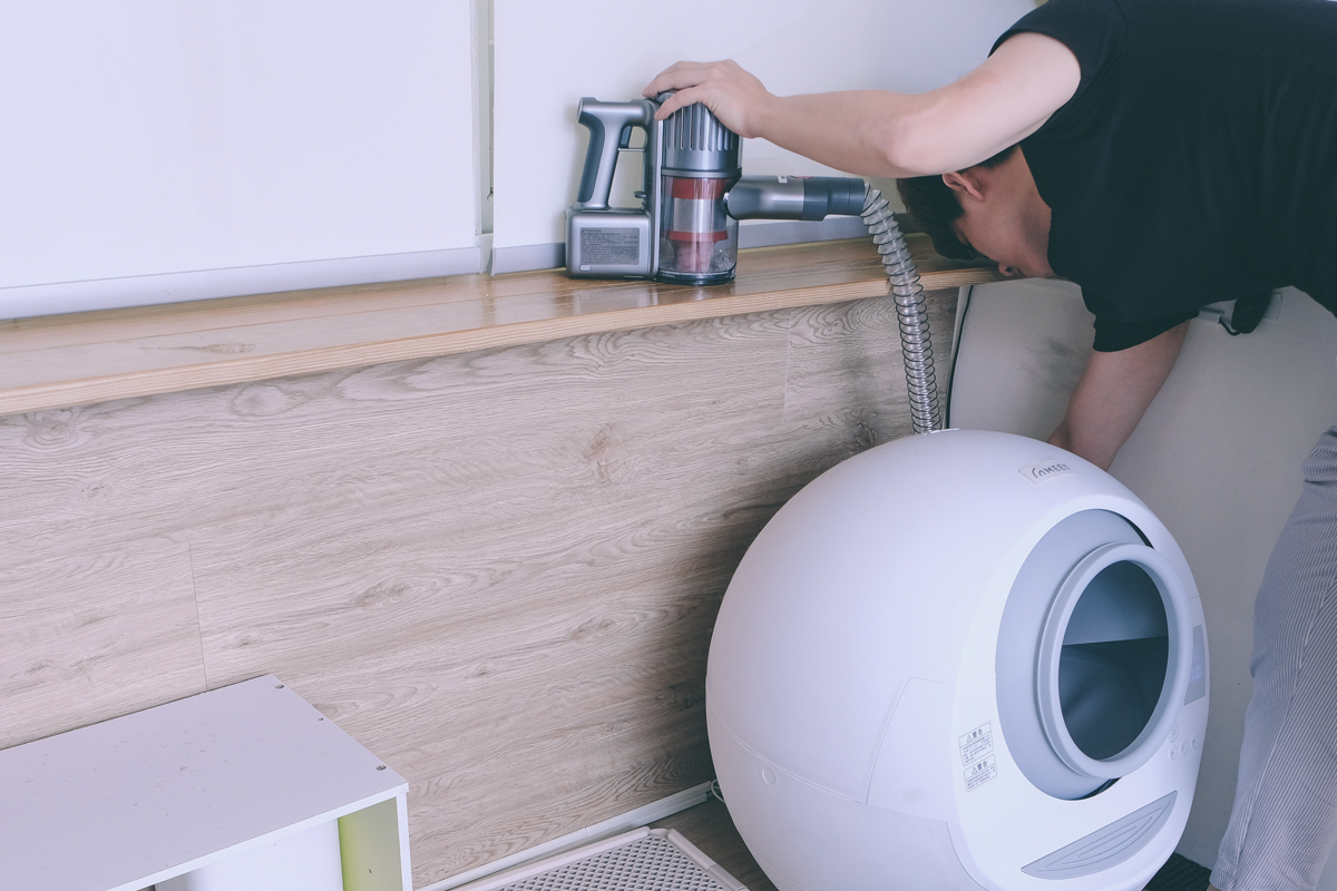 接下來就是進入喵星人的世界,前面我提到延伸軟管是我最愛用的配件之一,原因就是軟管可以使用的角度很彈性,比如像我接上延伸軟管再搭配扁平刷,就可以輕鬆的深入貓砂機的後方,不需要再搬出來就能清潔,第二個好處是,延伸軟管的長度很夠,在清潔的時候我也可以直接把主機放在窗台上,不需要手拿著(其實就是懶)。