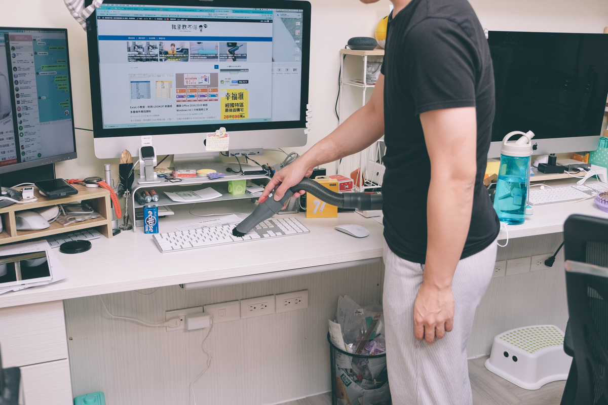 用延伸軟管再搭配短毛刷就可以如法炮製的輕鬆的打掃我的書桌各處包括很髒的鍵盤。