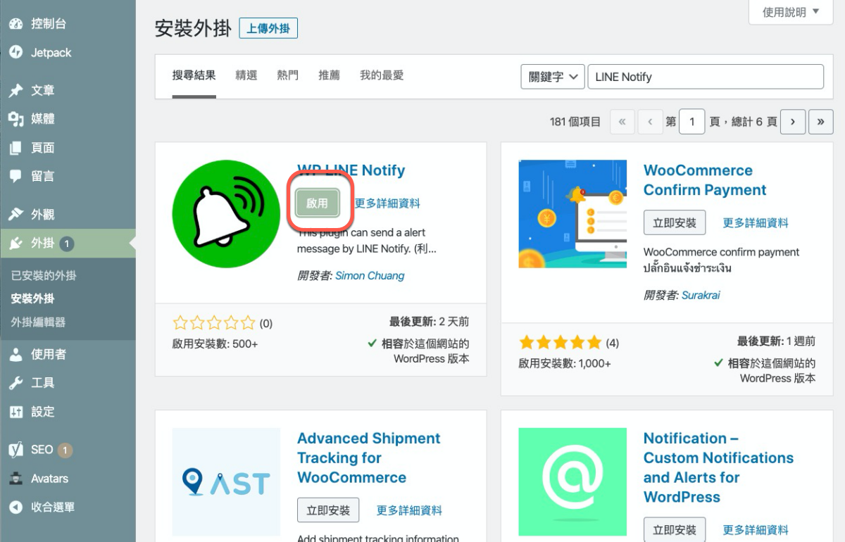 進入你的 WordPress 後台,在外掛 > 安裝外掛,輸入關鍵字 WP LINE Notify 搜尋,就會找到,直接安裝吧。