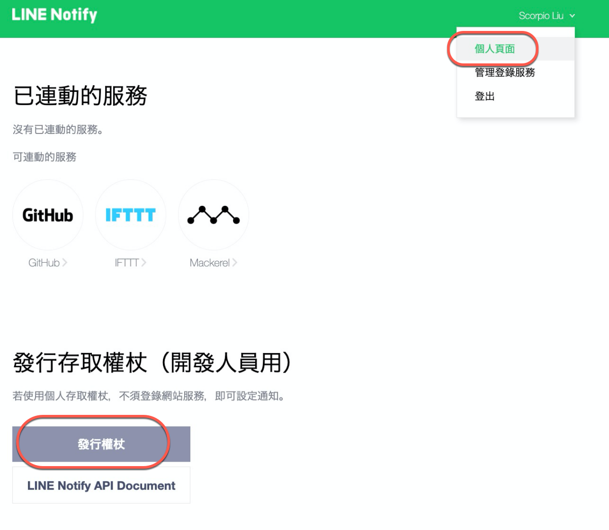 登入後右上角帳號下拉進入「個人頁面」,點擊下方的「發行權杖」。