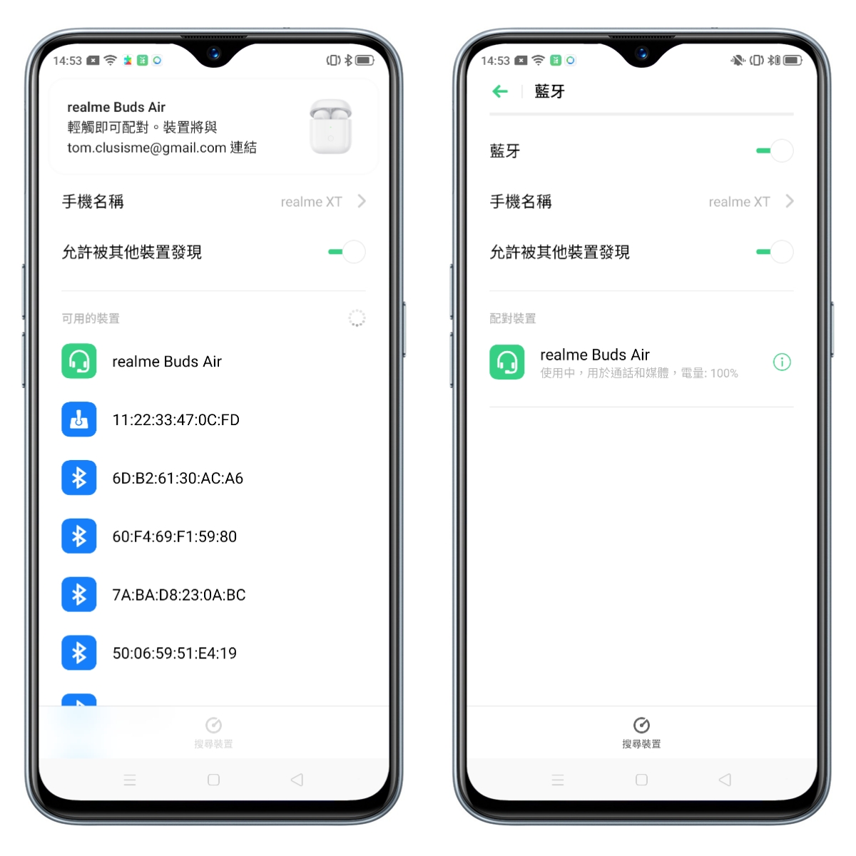 realme Buds Air 支援 Google 快速配對,只要按壓充電盒上的按鍵三秒以上,你的 Android 手機上就會跳出「輕觸即可配對....」,只要按一下就輕鬆搞定連結,如果你的手機沒跳出 Google 的快速配對提示,也可以自行進入藍牙設定選擇 realme Buds Air 進行配對,左右耳不需要分開完成配對,只要配對一次即可,之後只要打開耳機充電盒後即可自動連接。