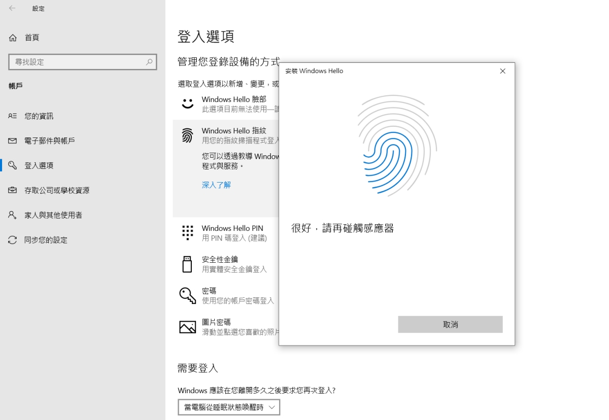 如果你選擇的是有指紋辨識器的規格,記得可以在 Widnows 10 的設定中,找到 Windows Hello 來設定指紋。