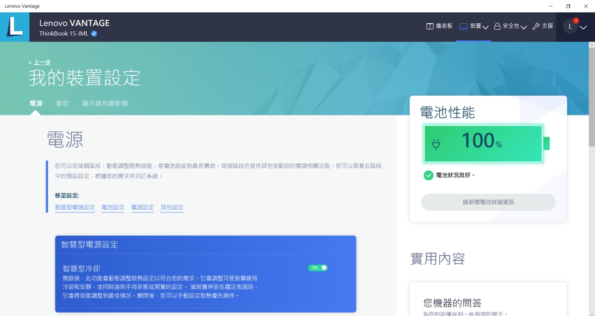 在裝置中也能看到目前的電池狀況,比較特別的是還有「智慧型電源設定」,這個功能主要是會依據使用狀況動態的調整散熱設定,自動將效能與散熱調整在最佳狀況。