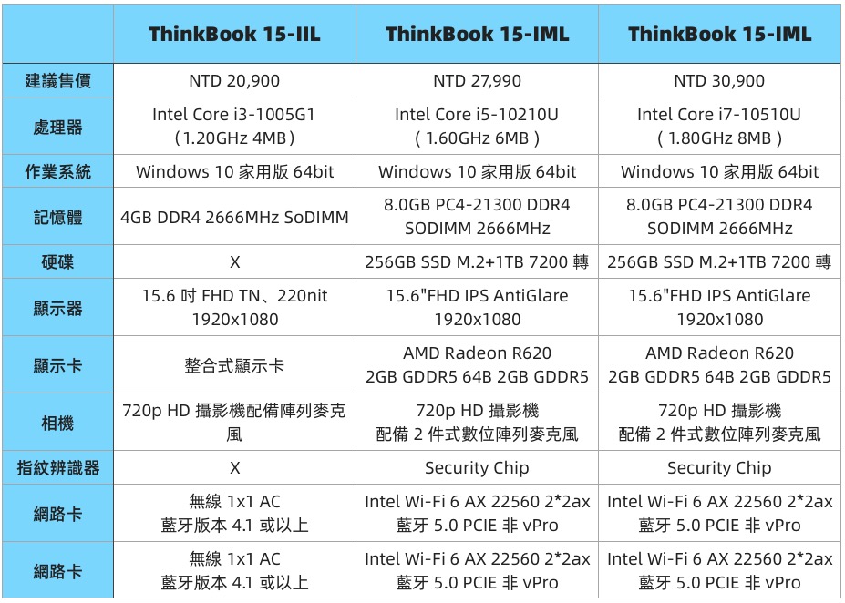 ThinkBook 15 預設主要有三種規格,最低從 NTD 20,900 元起到 NTD 30,900,後面二個主要差在處理器,不過只差 3 千塊真的蠻可以考慮直上 i7 的版本,不過不論哪一款都是採用第十代 Intel 處理器,效能都是有相當基本的水平。