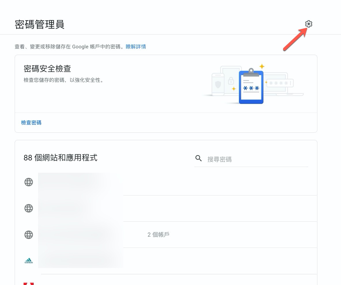 網址:https://passwords.google.com/進入網站後,登入你的 Google 帳號,點擊右上角的齒輪圖示。 在這頁面裡你也可以查看全部的服務有哪些,也能檢查密碼的安全性。