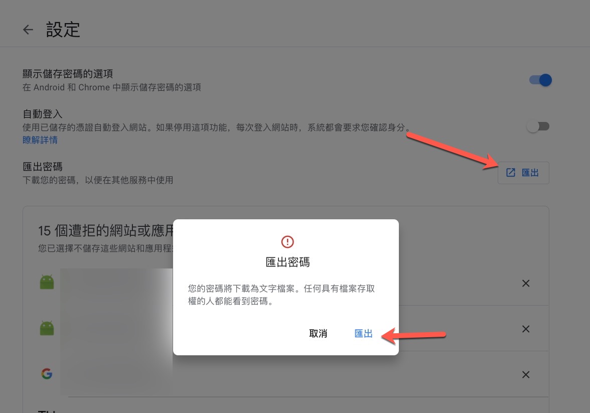 然後點擊匯出密碼,再按一次匯出,會要求再輸入一次你的 Google 密碼後就能匯出檔案。