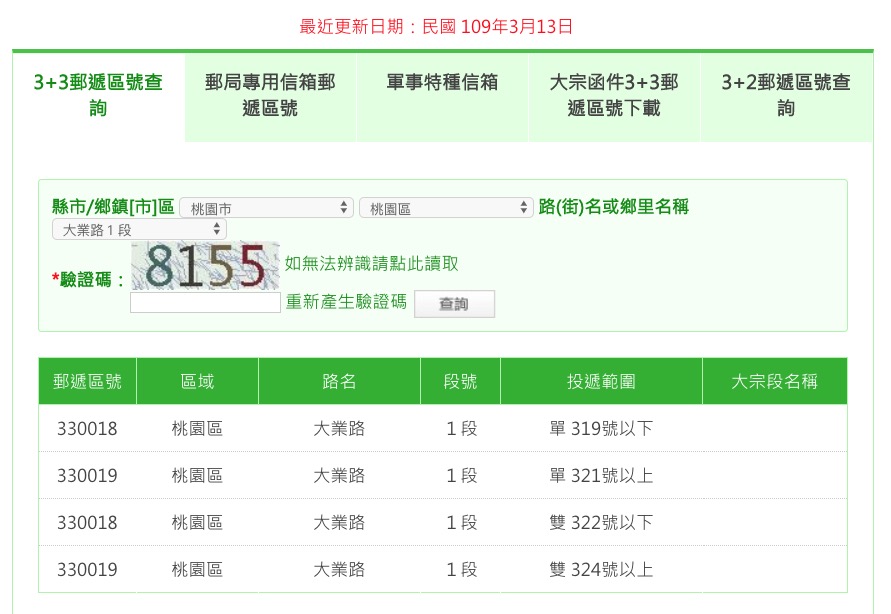 目前 3+2 仍然有保留在頁面上,放在第一個位置,取而代之的就是新制 3+3 郵遞區號查詢,使用跟原本其實都一樣,只要選擇縣市區域路段就可以了,你就會看到分的比之前更加的細囉,希望大家都能養成 3+3 的習慣。。