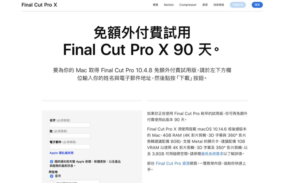 下載的方式也相當簡單,只要前往 Final Cut Pro X 官網輸入姓名與 email 電子郵件地址後就能下載使用。