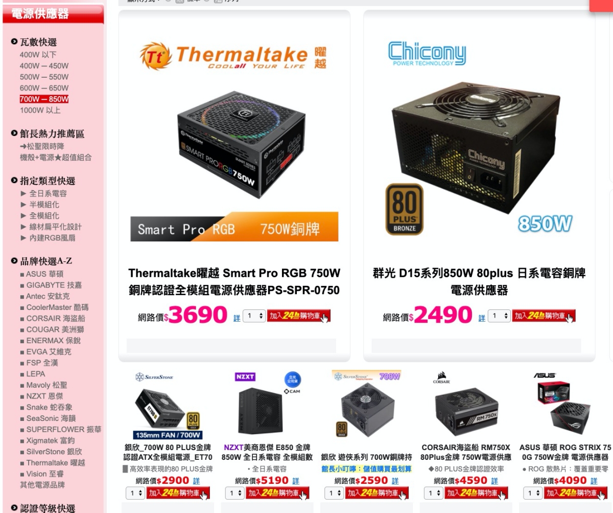如果計算瓦數後,你不知道應該買哪一個型號的電源供應器,也可以直接在 PChome 上找一下,因為有瓦數區間選擇,可以輔助你更快找到需求的電源供應器。