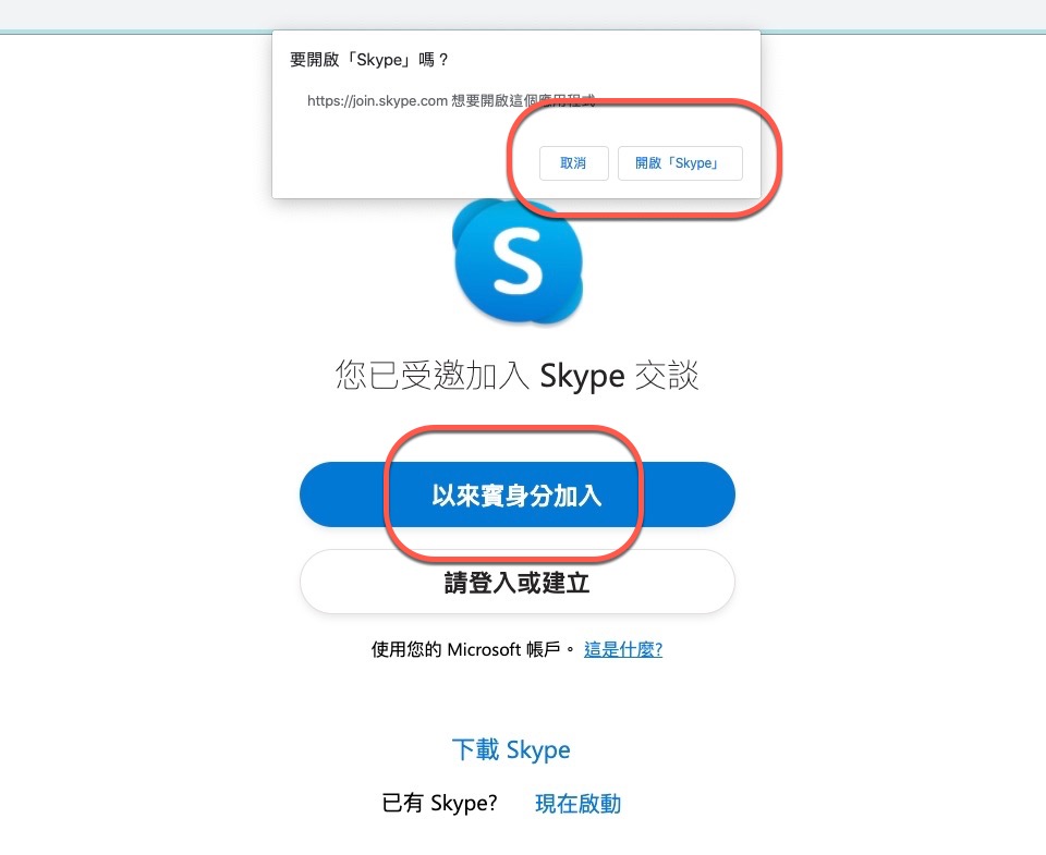 加入的時候,如果你的電腦有安裝 Skype 會出現這畫面,問你要不要透過 Skype 來開啟,當然你也可以取消,直接「以來賓身份加入」。