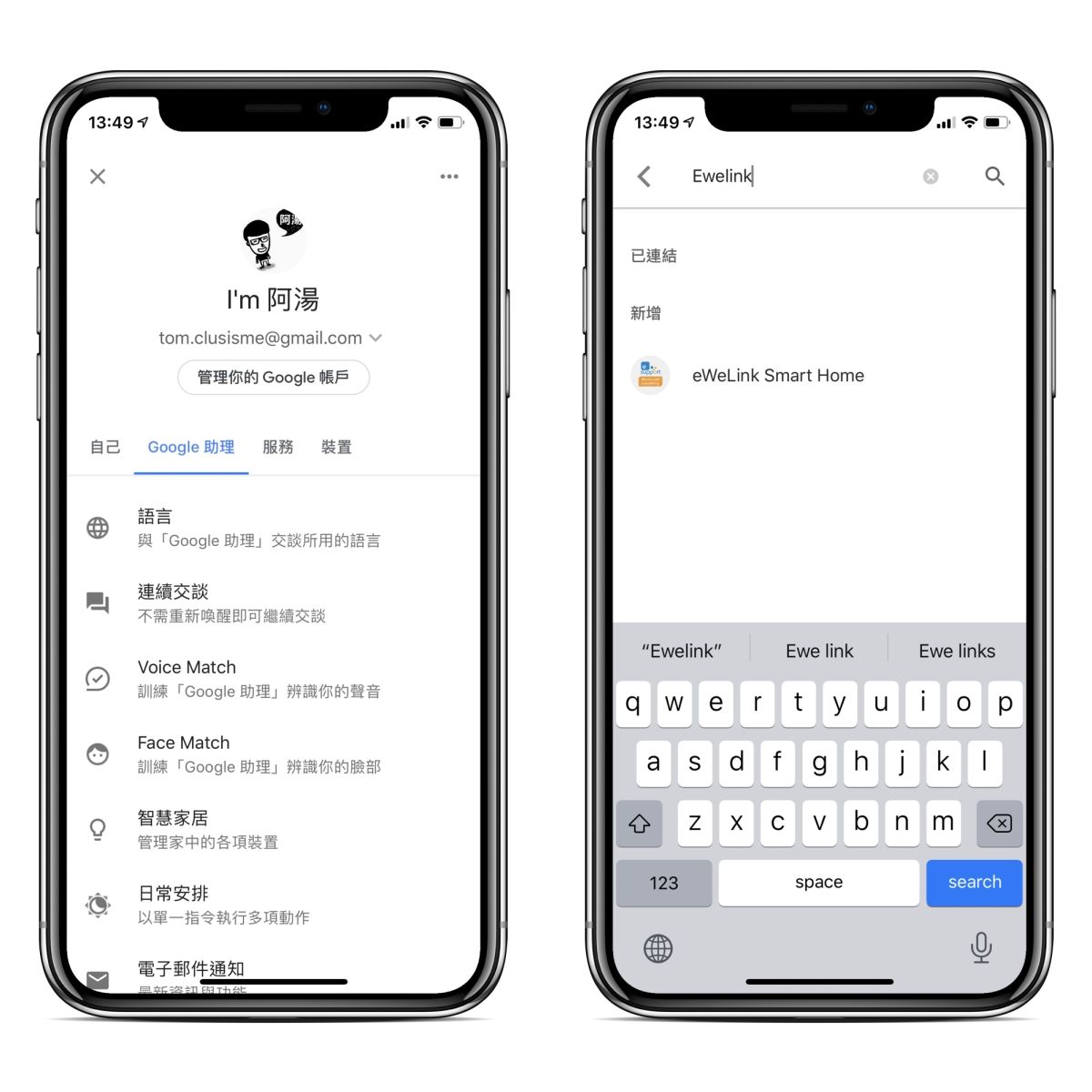 如果你想要用 Google 語音助理來控制的話,像是手機、Nest mini 等裝置,那就在 Google 語音助理中,進入智慧家居增加帳號,搜尋 eWeLink 就會看到了。