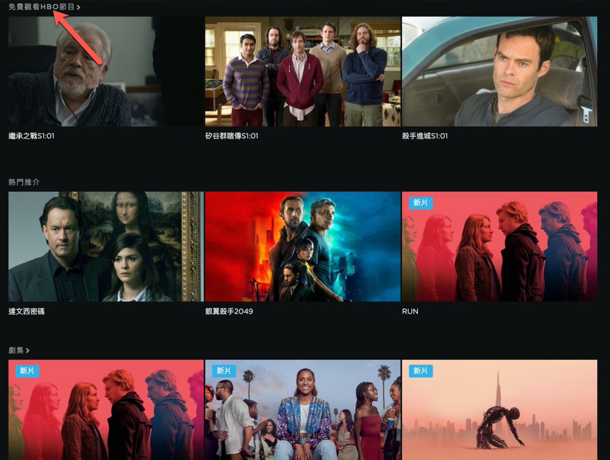 進入後雖然有很多分類跟影集,但不是全部都免費,只有第一個類別裡的「免費觀看 HBO 節目」才是免費的,不過也有不少熱門的影集就是。