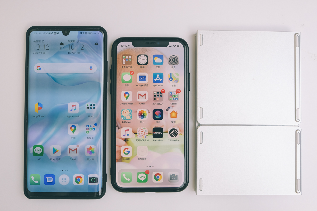 先給大家看一下折疊起來的大小,最左邊是 HUAWEI P30 Pro,中間是 iPhone Xs,折起來真的蠻小的吧,常看到的二折的大小也差不多是這樣,但普遍都沒有 TouchPad。