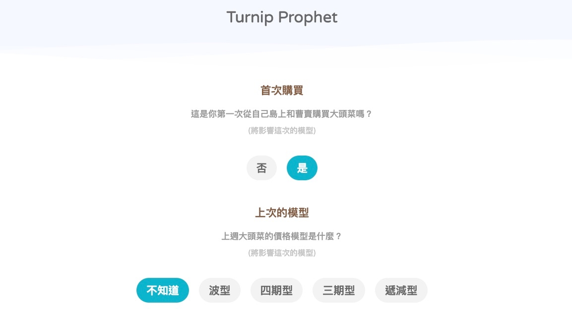 目前網路上的大頭菜計算機大概超過十個以上,有台灣自製的、日本的,也有教你怎麼分析的內容,不過試了幾個下來,發現這個「Turnip Prophet」算是相較之下比較準確且介面也相當不錯的,就分享給大家用看看。