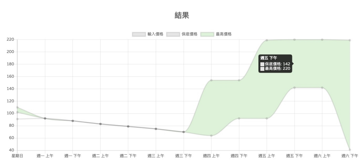 上面內容輸入後就會在下方直接顯示結果,會有個價格區間,大致上來說,普遍最好的價格都落在週四之後,所以你週一到週三大致上都可以放心的搜集資料就好了。