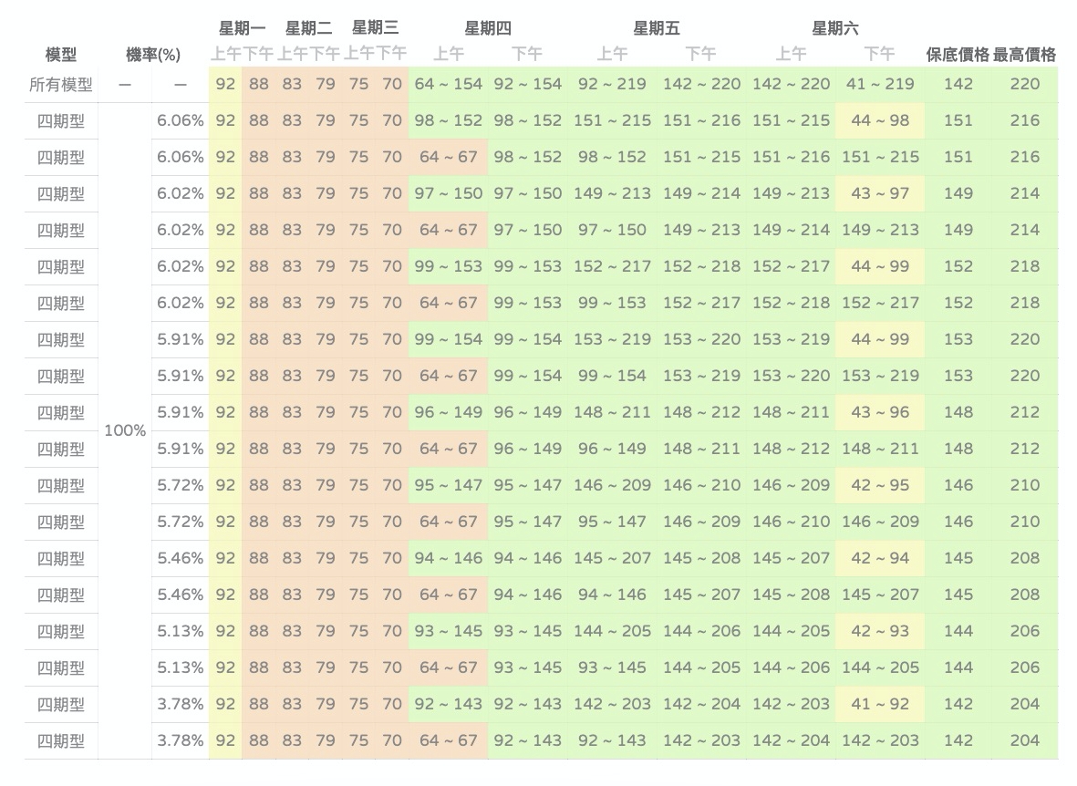 最後還會有一張表格告訴你的資料預測,包括可能的模型、後續價格的機率等,像阿湯這週的價格就屬於四期型,已經是確定的了,最高也就是大概 2.x 倍左右的價格可以售出,其實已經不錯了,就如同前面講的,只要不是遞減型都好,不然要是投入全部資金就是賠到脫褲子了。