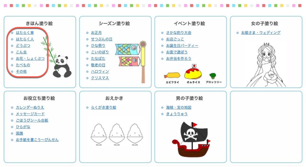 網站:http://kids-nurie.com/在網站往下拉一點,這裡就有各種分類,你可以先隨便點一個進去,看不懂這些日文也沒差,一個個分類慢慢看就可以了。