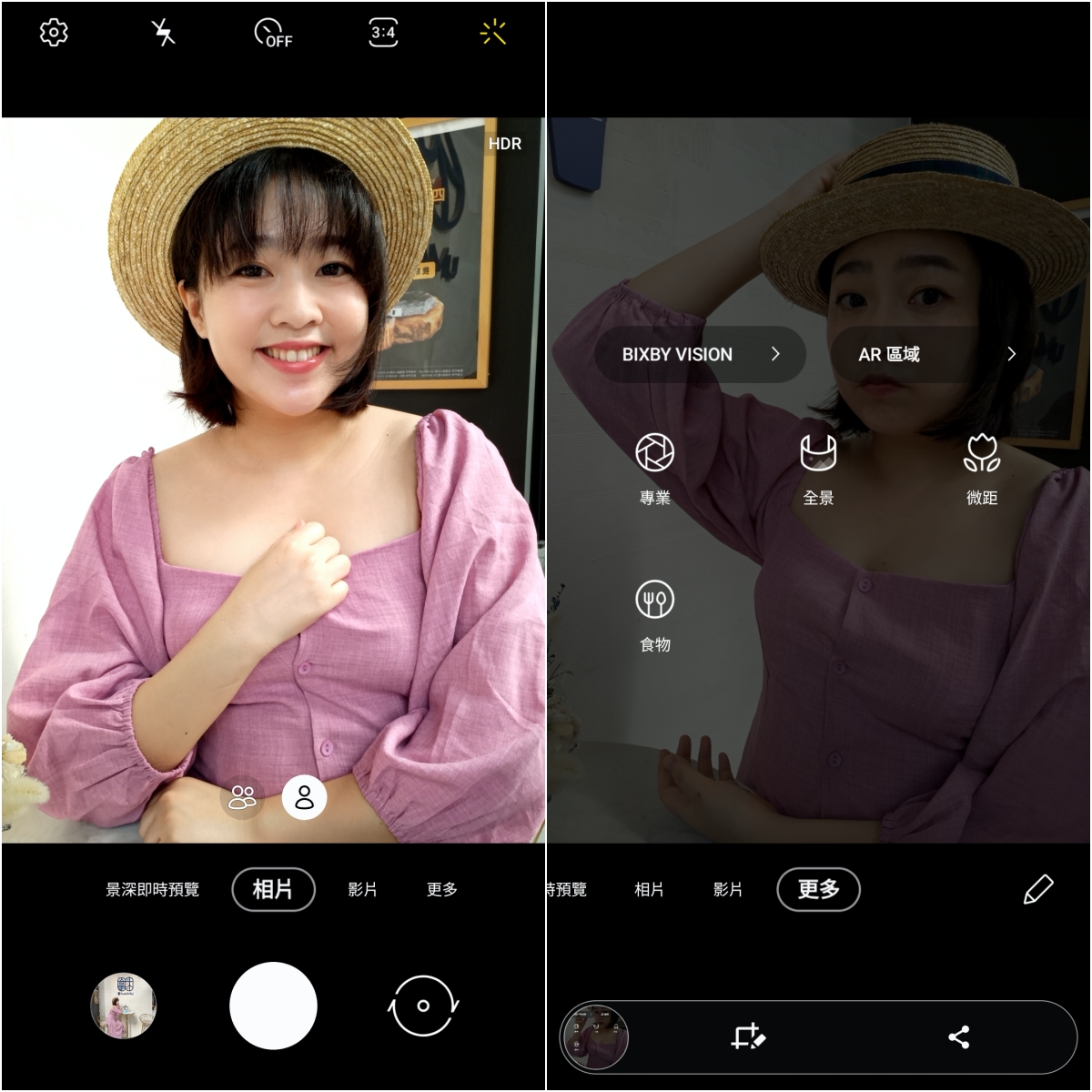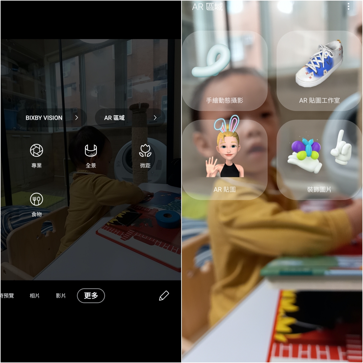 在更多功能中,不論前置或後置鏡頭都有 AR 區域、微距等實用及有趣的功能,以 AR 區域來說,就包括了先前就在旗艦機上率先推出過的手繪動態攝影、AR 貼圖工作室、AR 貼圖等,都是相當有趣且可以用來和好友們互動的工具。