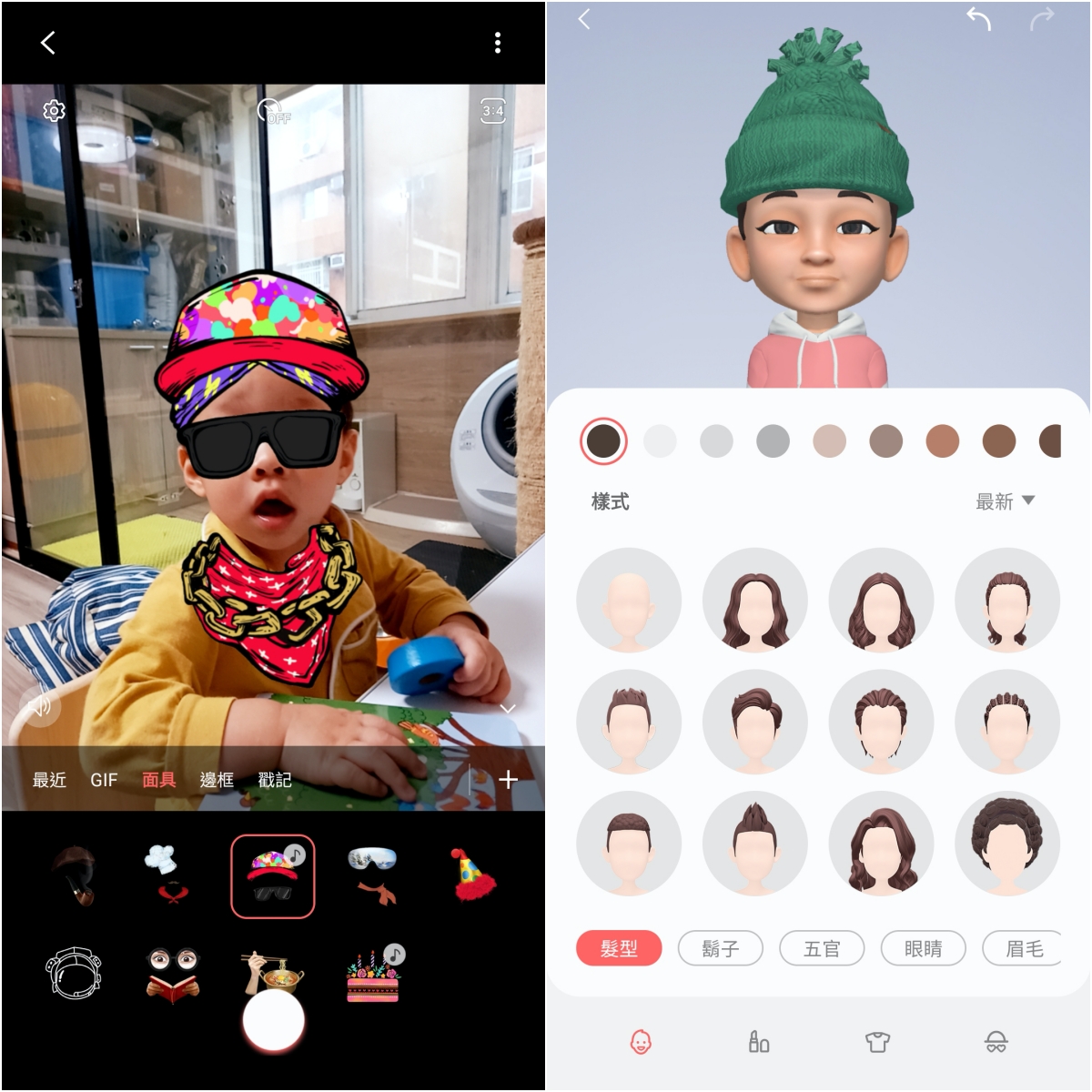 這即時的 AR 攝影功能,不論玩幾次都不會膩,就跟我們平常在 Facebook 上視訊時也都會玩一樣,而 AR 貼圖,比起以往的製作又更加精細,能夠設定的項目也越來越多。