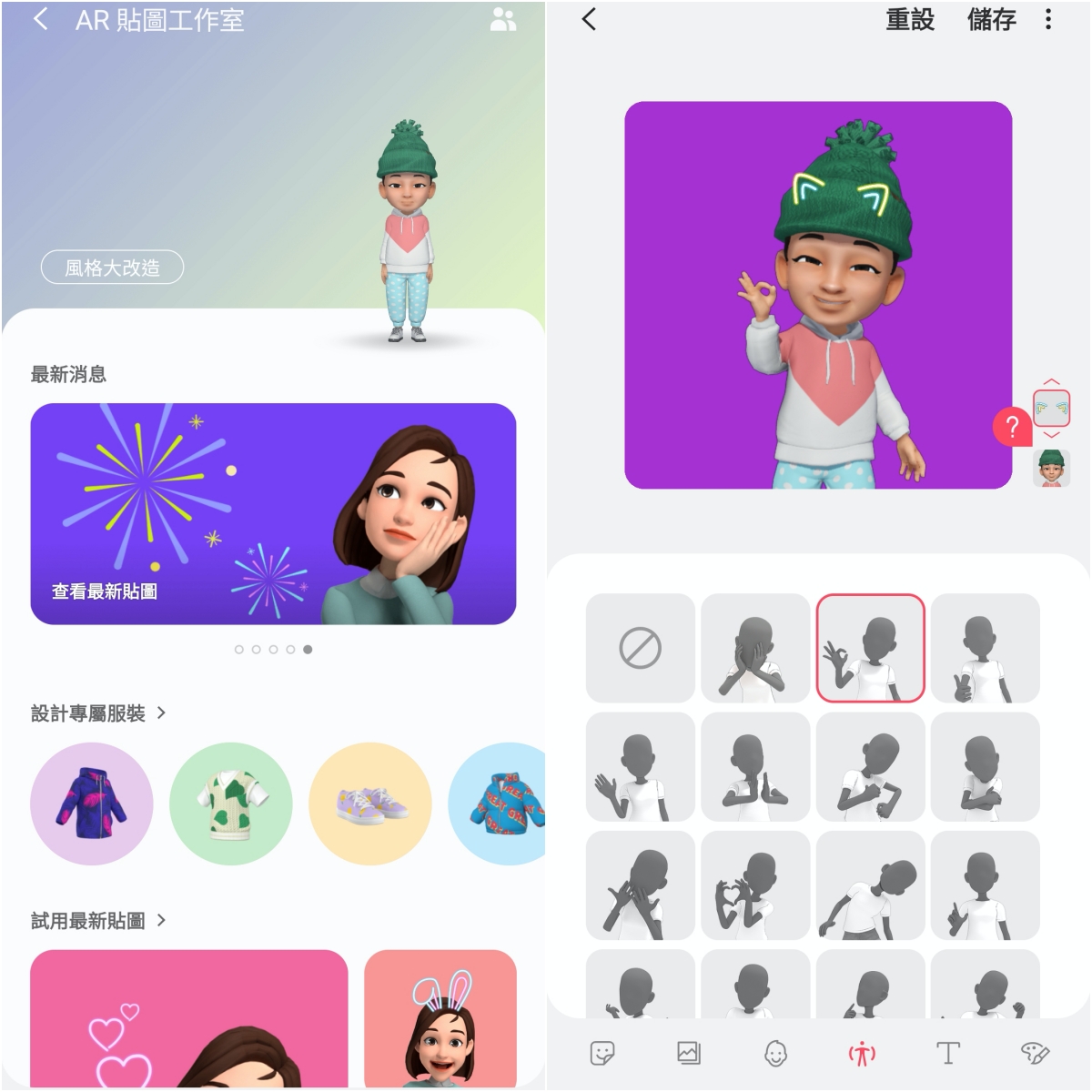 透過 AR 貼圖工作室還能夠自訂更多專屬於你自己的 AR 貼圖,除了配置一些可愛的符號、文字外,還有很多動作可以讓你選擇,製作出專用的貼圖,就可以用來傳送給好友,不用再花錢買貼圖啦。