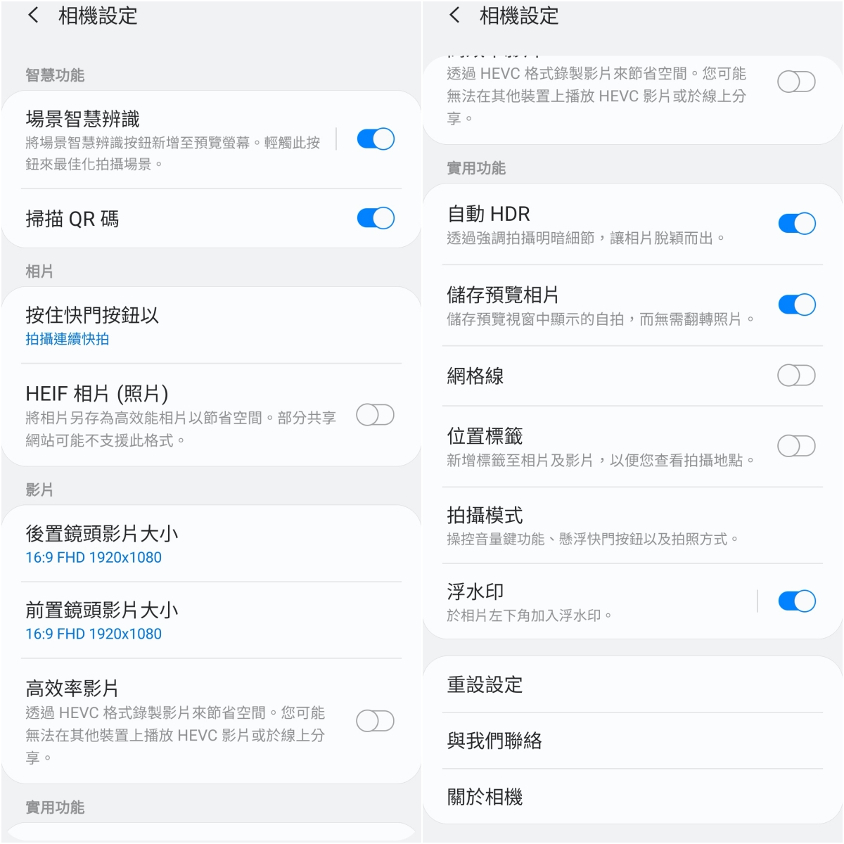 在相機設定中,包括可以開啟內建 20 種 AI 場景智慧辨識功能、自動 HDR 以及拍照輔助很實用的「網格線」,另外我也蠻推薦可以開啟浮水印,加入自己想要顯示的文字,我覺得可以讓照片的質感大提升,不知道為什麼加上點字看起來就是大不同。