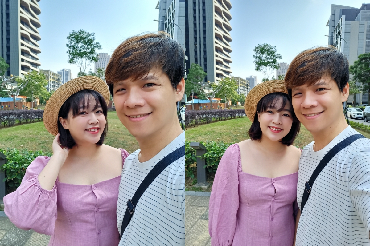 前置鏡頭的廣角差異,大約比起原本的廣角差異 1.5 倍左右,原本二人自拍,大概可以變成到 3~4 人沒有問題,如果要更多人的話,只要把手機打橫,我之前試過最多 6 人都可以擠進來。