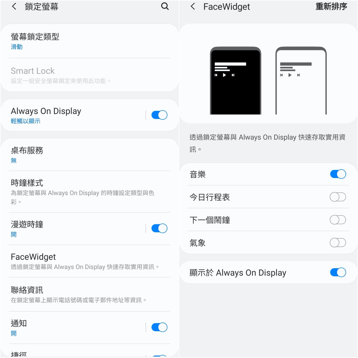 支援 AOD 螢幕顯示,可以在待機的螢幕上顯示資訊,並透過 FaceWidget 設定,選擇要顯示哪些東西,讓你不用喚醒手機就能查看或控制音樂。