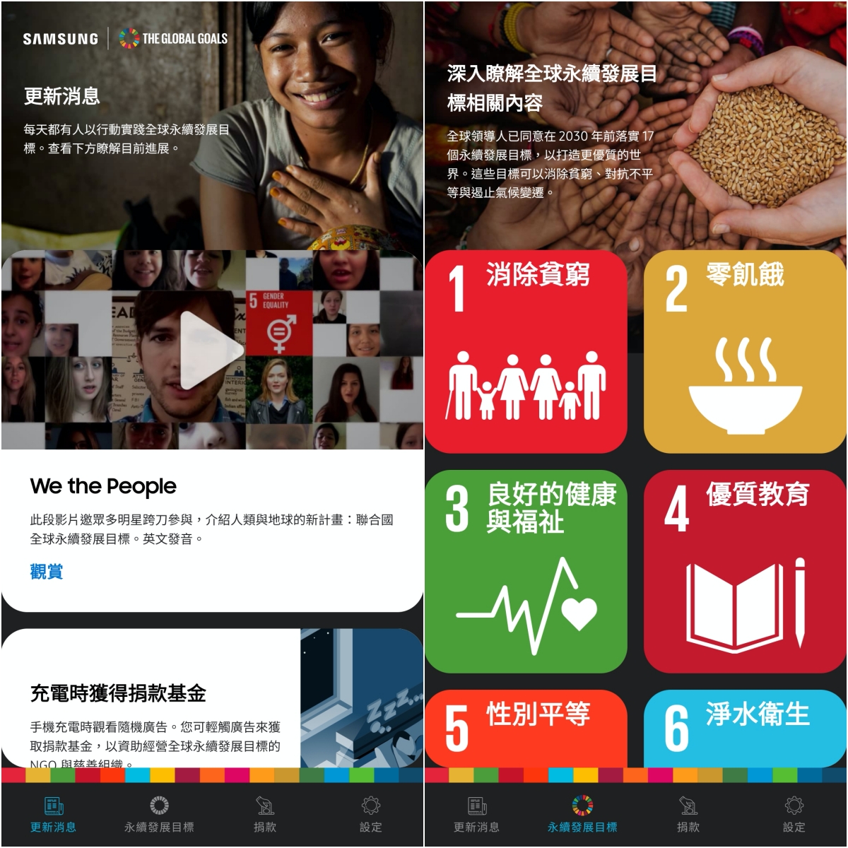最後一個想推薦的是 Samsung Global Goals 這個 APP,平常阿湯本來就有捐款的習慣,除了有固定捐款的單位外,平常有注意到一些弱勢的單位等,有需求我也會進行捐款,而這個 Global Goals,只要你開啟後,就會在你充電不使用時,在螢幕上播放廣告,只要你點擊廣告就能夠捐款出去,用來資助 NGO 與慈善組織,我覺得是相當有意義的一件事,二話不說就是開啟,還把我其他 Samsung 的手機立刻都打開了。